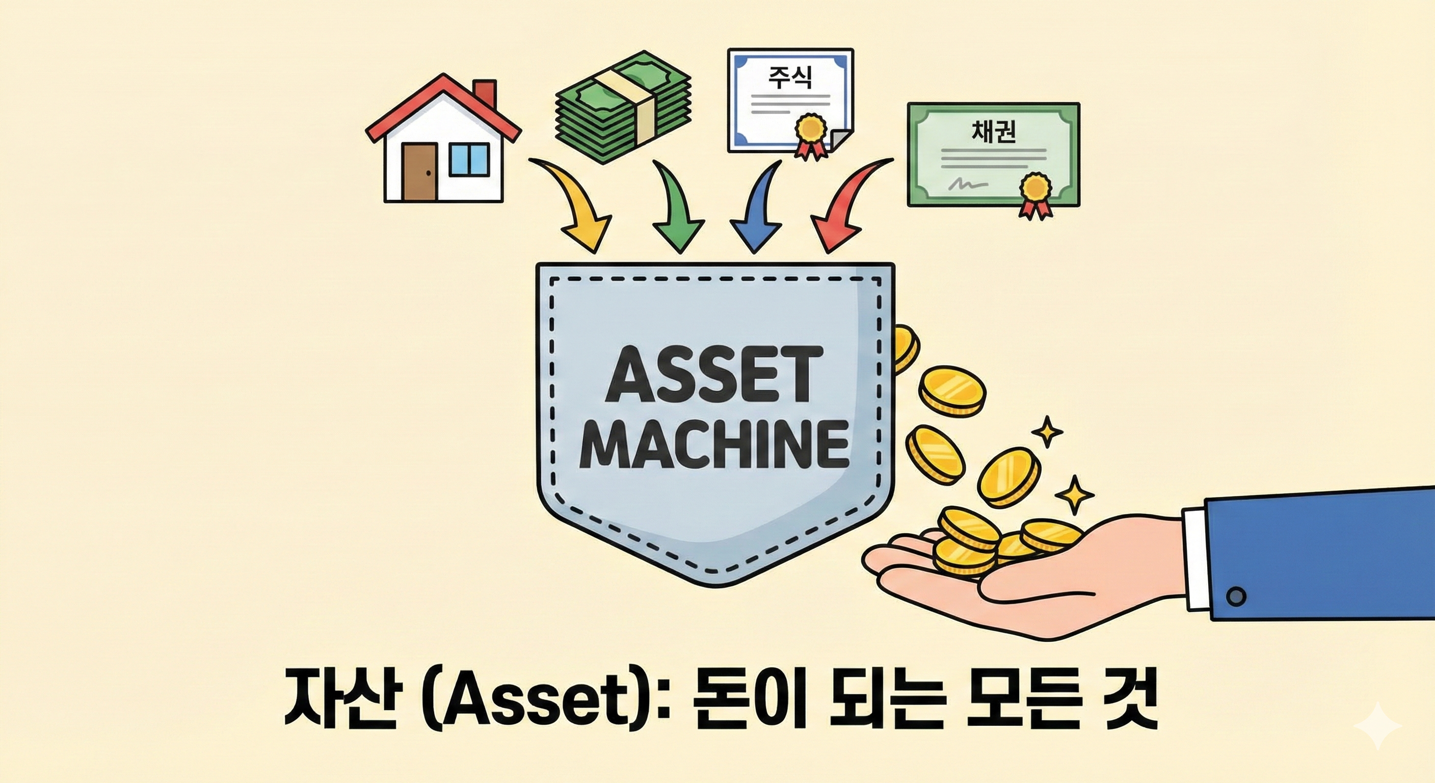 자산이란 어렵게 생각할 필요 없이, 앞으로 나에게 경제적 이익을 가져다줄 수 있는 것들을 말해요. 여러분이 모아둔 현금, 살고 있는 집, 그리고 앞으로 투자하게 될 주식·채권 같은 금융자산 모두 여기에 포함되죠.