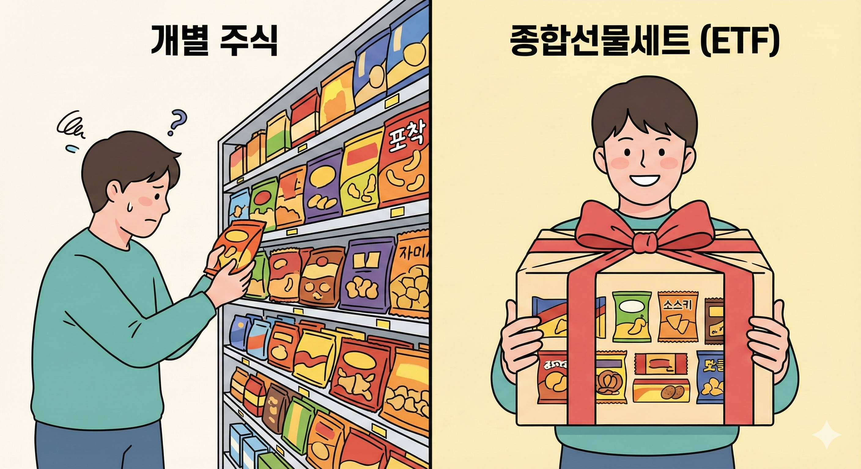 · 개별 종목을 고르기 어려운 초보자에게는 **여러 우량 자산을 모아놓은 ETF(종합선물세트)**가 큰 도움이 된다.